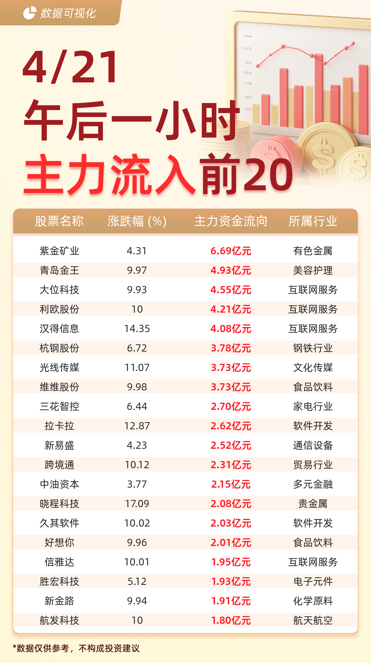 截至4月21日午后一小时,主力资金流入前20的股票分别为:紫金矿业(6.69亿元)、青岛金王(4.93亿元)、大位科技(4.55亿元)、利欧股份(4.21亿元)、汉得信息(4.08亿元)、杭钢股份(3.78亿元)、光线传媒(3.73亿元)、维维股份(3.73亿元)、三花智控(2.70亿元)、拉卡拉(2.62亿元)、新易盛(2.52亿元)、跨境通(2.31亿元)、中油资本(2.15亿元)、晓程科技(2.08亿元)、久其软件(2.03亿元)、好想你(2.01亿元)、信雅达(1.95亿元)、胜宏科技(1.93亿元)、新金路(1.91亿元)、航发科技(1.80亿元)。