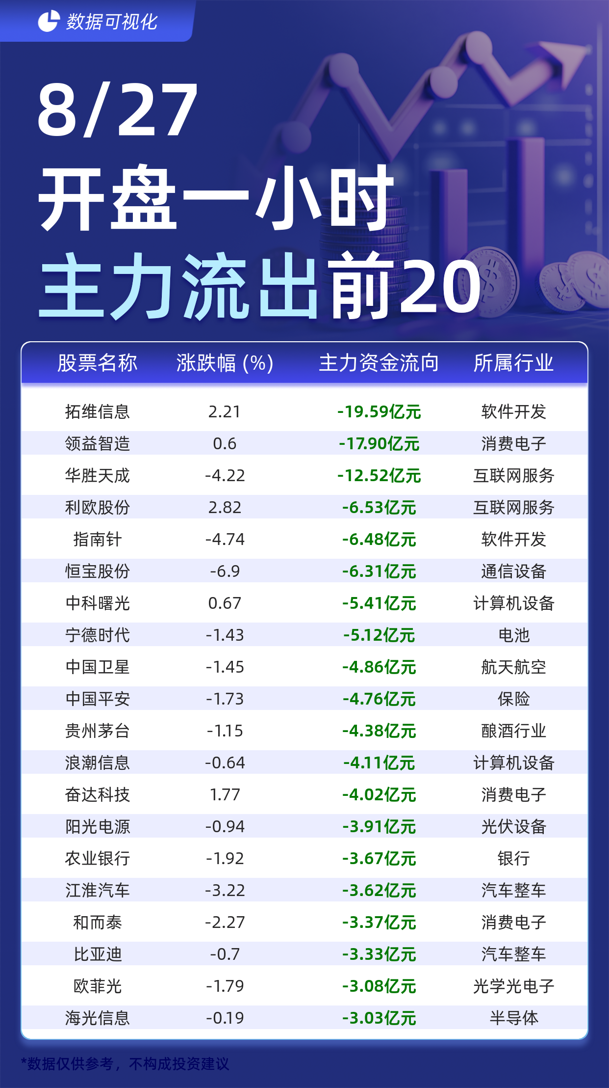 截至8月27日开盘一小时,主力资金流出前20的股票分别为:拓维信息(-19.59亿元)、领益智造(-17.90亿元)、华胜天成(-12.52亿元)、利欧股份(-6.53亿元)、指南针(-6.48亿元)、恒宝股份(-6.31亿元)、中科曙光(-5.41亿元)、宁德时代(-5.12亿元)、中国卫星(-4.86亿元)、中国平安(-4.76亿元)、贵州茅台(-4.38亿元)、浪潮信息(-4.11亿元)、奋达科技(-4.02亿元)、阳光电源(-3.91亿元)、农业银行(-3.67亿元)、江淮汽车(-3.62亿元)、和而泰(-3.37亿元)、比亚迪(-3.33亿元)、欧菲光(-3.08亿元)、海光信息(-3.03亿元)。