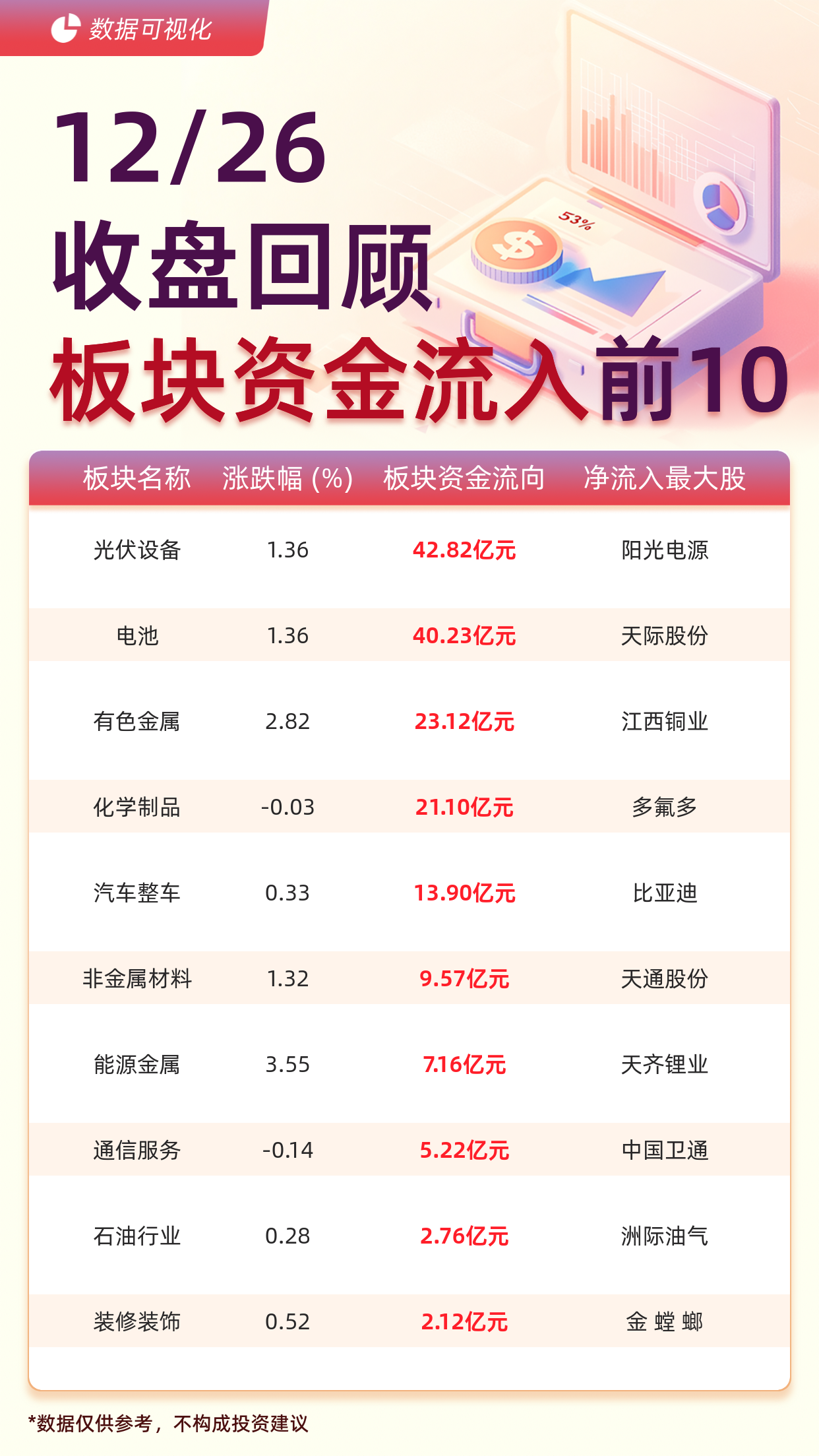 据交易所数据显示,截至12月26日收盘,大盘主力资金净流出365.44亿元。主力资金流入前十大板块分别为:光伏设备(42.82亿元)、电池(40.23亿元)、有色金属(23.12亿元)、化学制品(21.10亿元)、汽车整车(13.90亿元)、非金属材料(9.57亿元)、能源金属(7.16亿元)、通信服务(5.22亿元)、石油行业(2.76亿元)、装修装饰(2.12亿元)。
