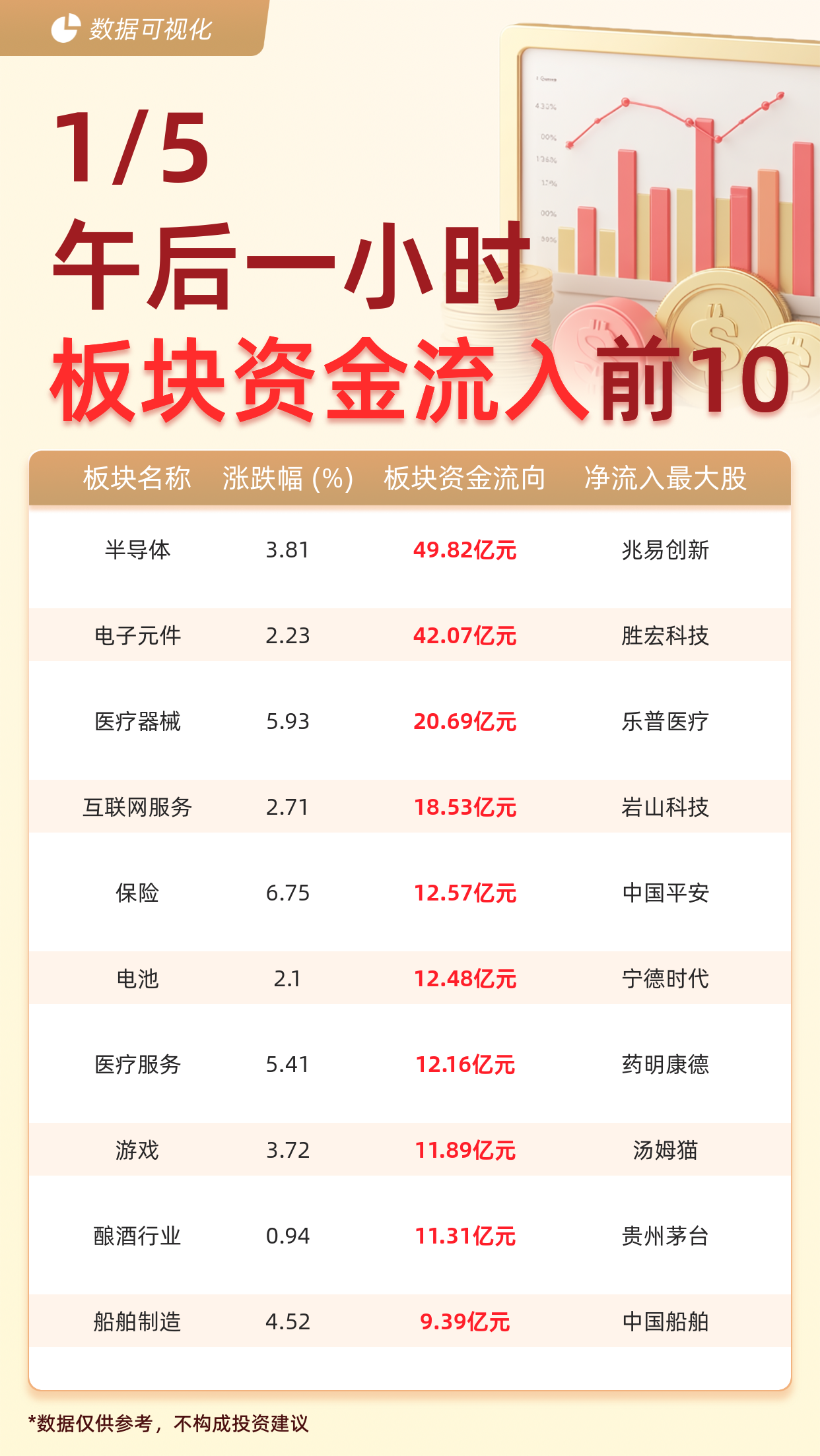 据交易所数据显示,截至1月5日午后一小时,大盘主力资金净流入2.32亿元。主力资金流入前十大板块分别为:半导体(49.82亿元)、电子元件(42.07亿元)、医疗器械(20.69亿元)、互联网服务(18.53亿元)、保险(12.57亿元)、电池(12.48亿元)、医疗服务(12.16亿元)、游戏(11.89亿元)、酿酒行业(11.31亿元)、船舶制造(9.39亿元)。